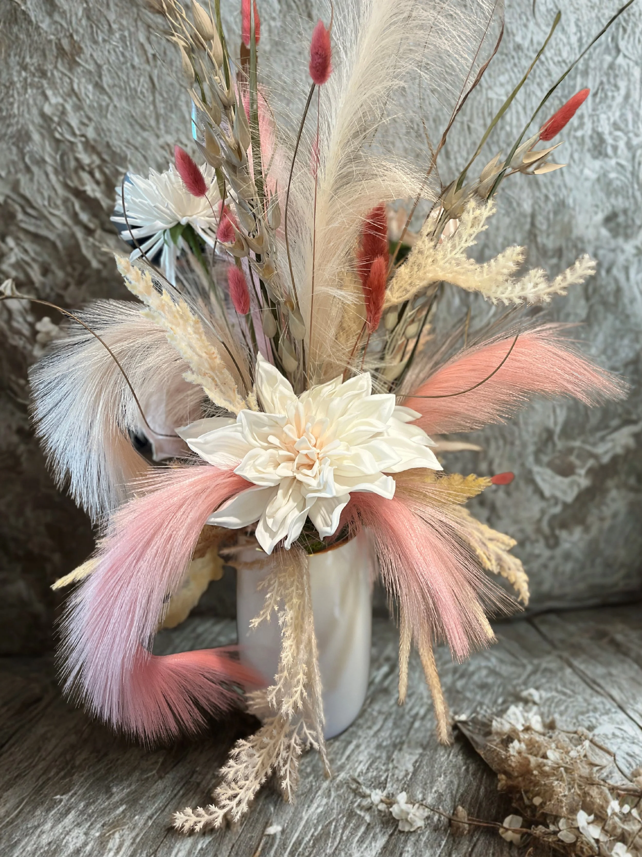 A soft, blush-toned arrangement filled with airy grasses, delicate forals, and warm textures - created to bring comfort, personality, and a little beauty to a new space.