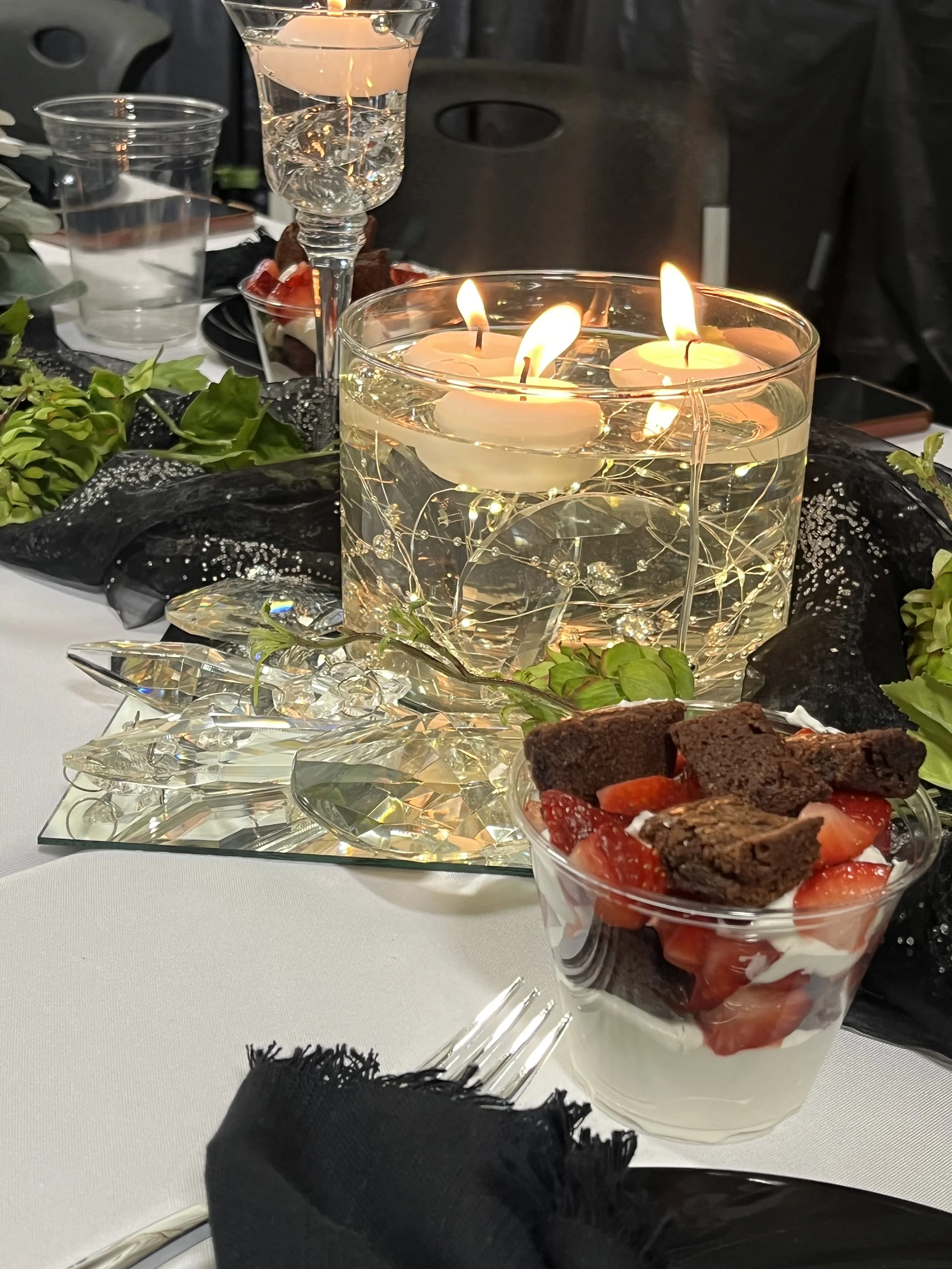 A warm, elegant table setting with floating candlelight, layered black textures, greenery, and subtle sparkle - styled to make the moment shine.